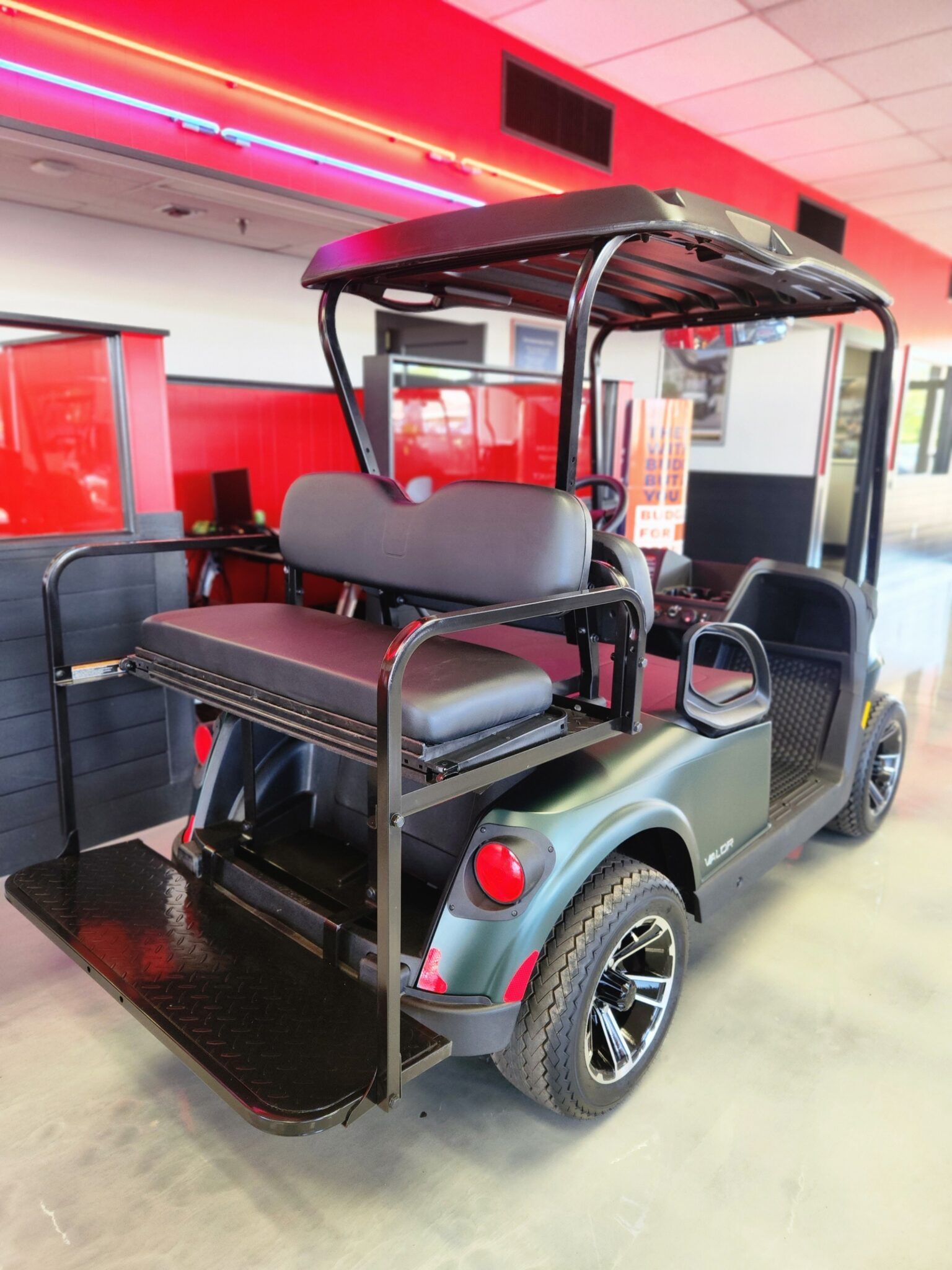 • Flip Down Back Seat with Upgraded Arm Rests and Safety Grab Bar
